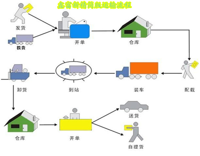 1:客戶將貨物送到公司或者由鑫富公司派車外出上門接貨 →2:開單(貨物到達(dá)鑫富公司后,對貨物的具體數(shù)量,重量,體積,包裝開具貨物托運單)→3入庫(開好托運單后,倉庫對貨物進(jìn)行分類,場地擺放,貼上標(biāo)簽,做好標(biāo)識,區(qū)分。)→4:配載(貨物裝車,裝車工根據(jù)貨物的輕重,大小,數(shù)量的多少,以及包裝對貨物進(jìn)行車輛碼放配載,)→5:到站(車輛到達(dá)目的地倉庫,入庫,單據(jù)交接)→6:卸貨(車輛到達(dá)目的地倉庫后,卸貨工人根據(jù)貨物多少,大小,輕重,配送目的地距離遠(yuǎn)近進(jìn)行貨物卸載,分類)→7:開單:(單據(jù)核對,根據(jù)客戶要求以及貨物多少對貨物進(jìn)行配送或者通知客戶取貨)